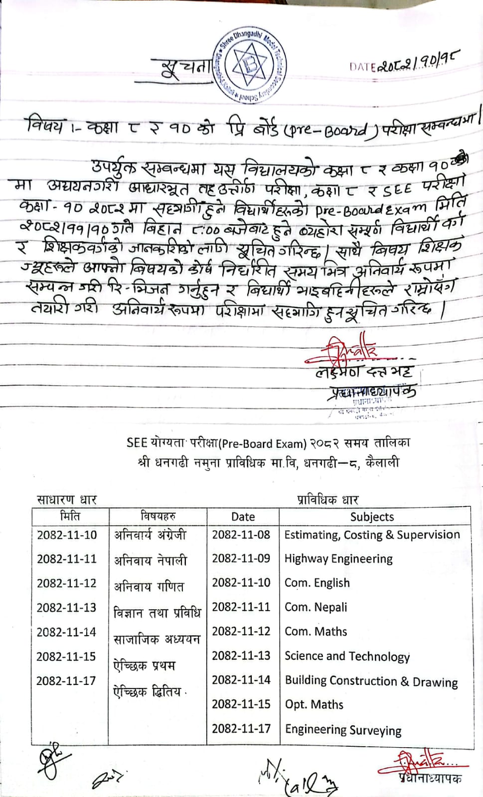 प्रि–वोर्ड नतिजा विश्लेषण तथा स्टाफ बैठक सम्वन्धमा सूचना