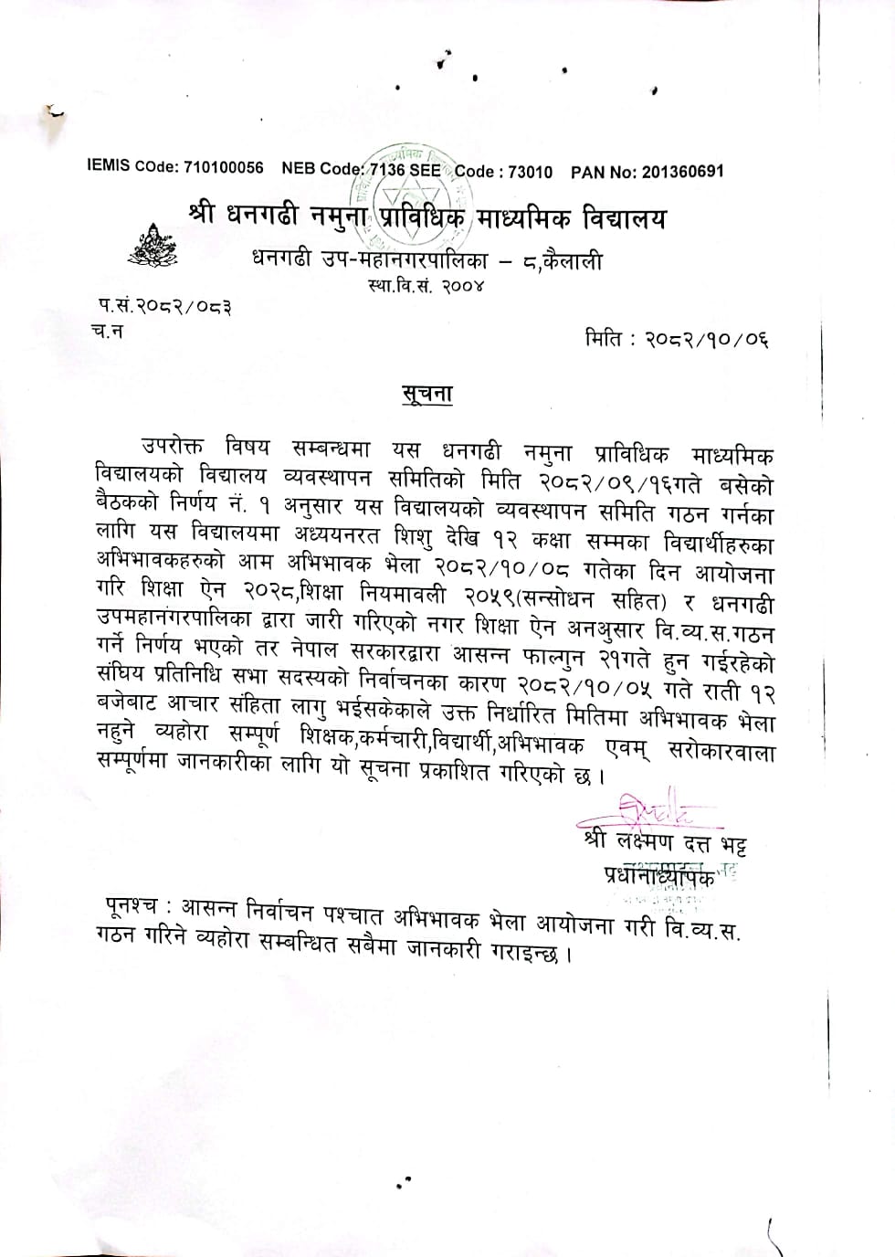 विद्यालय व्यवस्थापन समिति गठन गर्ने बारे अभिभावक भेला हुने सम्वन्धि अत्यन्त जरुरी सूचना ।