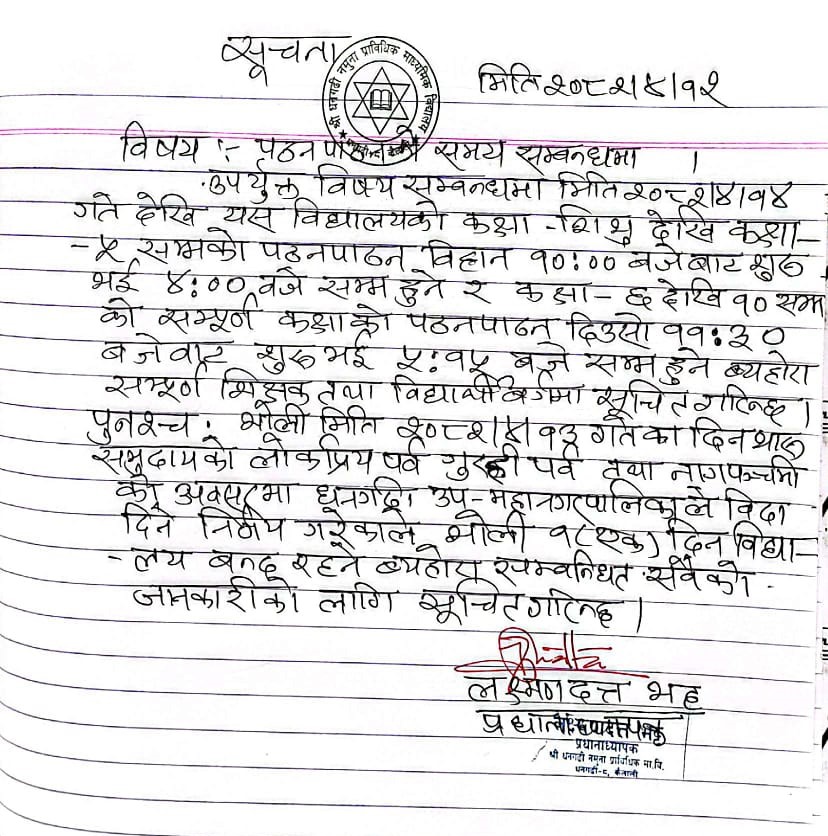 बिध्यालयकाे पठनपाठन सुचारू हुने सम्बन्धमा ।