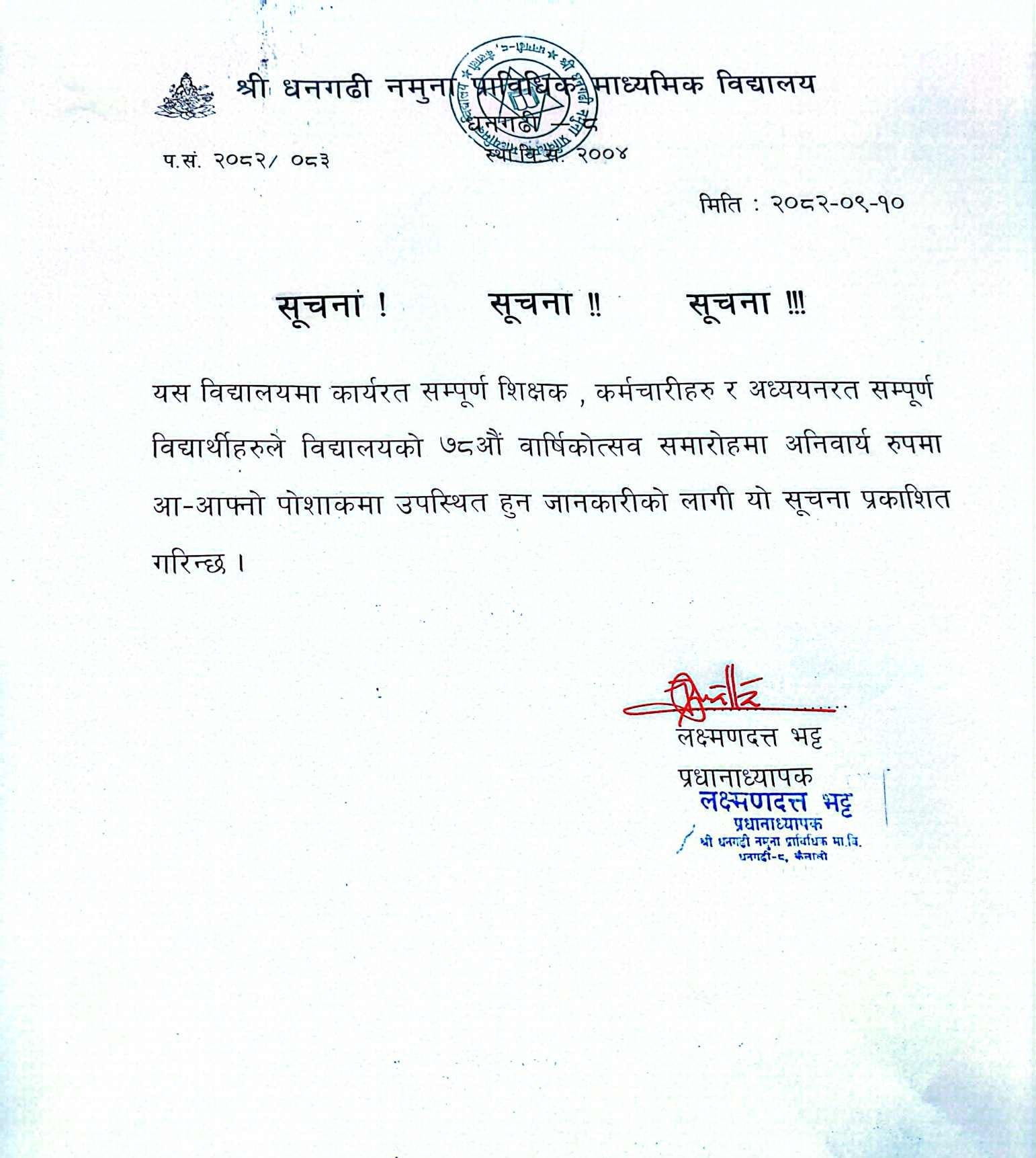 विद्यालयको ७६ औं बार्षिकत्सव संबन्धी सूचना |