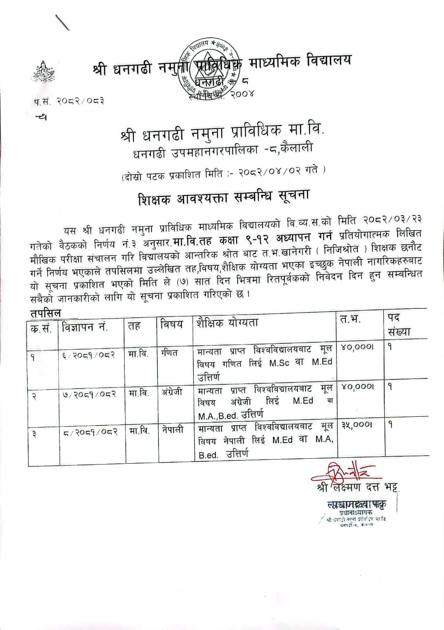श्री धनगढी नमुना प्राबिधिक मा. बि. मा दोश्रो पटक शिक्षक आवश्कता सम्बन्धि सुचना २०८१/०८२